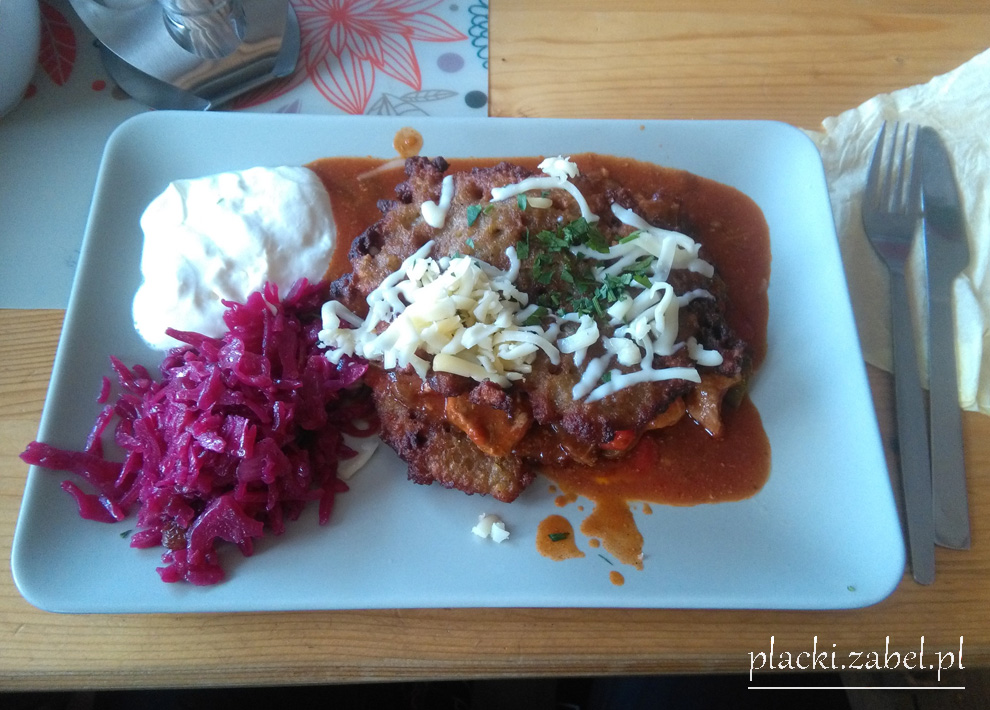 Bar prowadzony jest przez całkiem niezłego biegacza górskiego – Pawła Sobczyka. W sportowym CV ma np. wygraną w pierwszej edycji Biegu Granią Tatr czyli 70 km po Tatrach w niecałe 9 godzin. Wracając do placków. Porcja niewielka, ale smakowita. Placki dobre, wysmażone, gulasz trochę słodkawy, trochę pomidorowy, mało ostry. Czerwona kapusta na plus. 18 zł za porcję widoczną na zdjęciu to znośna cena, ale porcja mogłaby być ciut większa 🙂